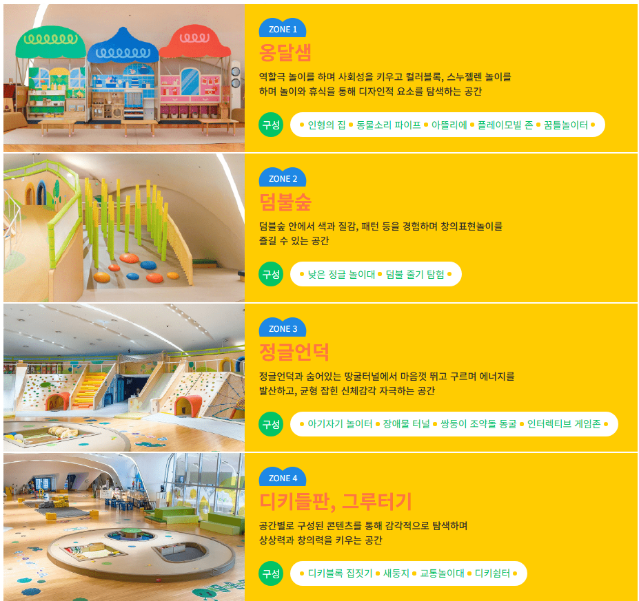🎯추천 연령: 3세 ~ 초등학생 특징: 음악, 미술, 과학, 요리 등 테마별 전시관 아이 눈높이에 맞춘 체험형 공간 도심 속 저렴하고 알찬 실내 장소, 다양한 프로그램 온라인 예약 후 이용 가능