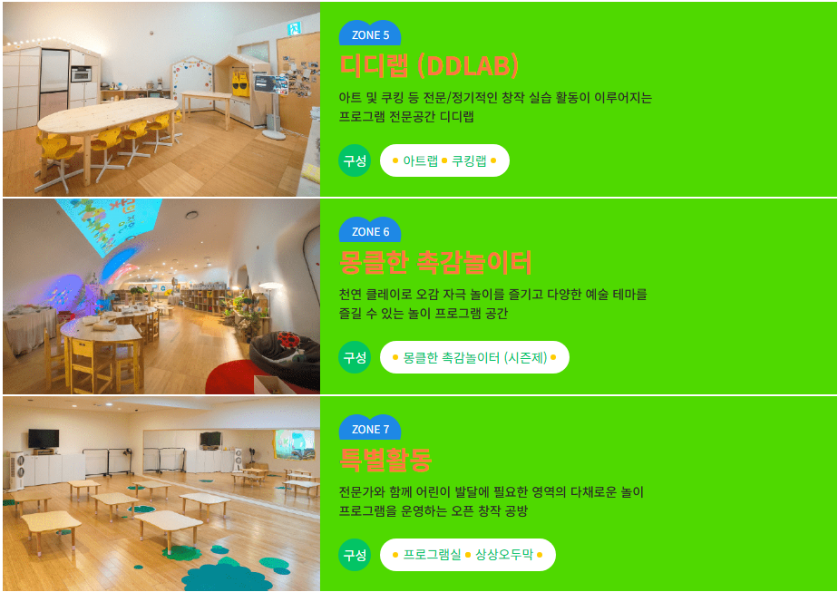 특징: 정글언덕, 인터렉티브존, 동물소리 파이프등 감각 놀이 콘텐츠가 풍부 유아 발달 프로그램 운영, 아트, 쿠키, 천연 클레이등 다양한 예술 테마를 즐길 수 있는 놀이 프로그램 체험