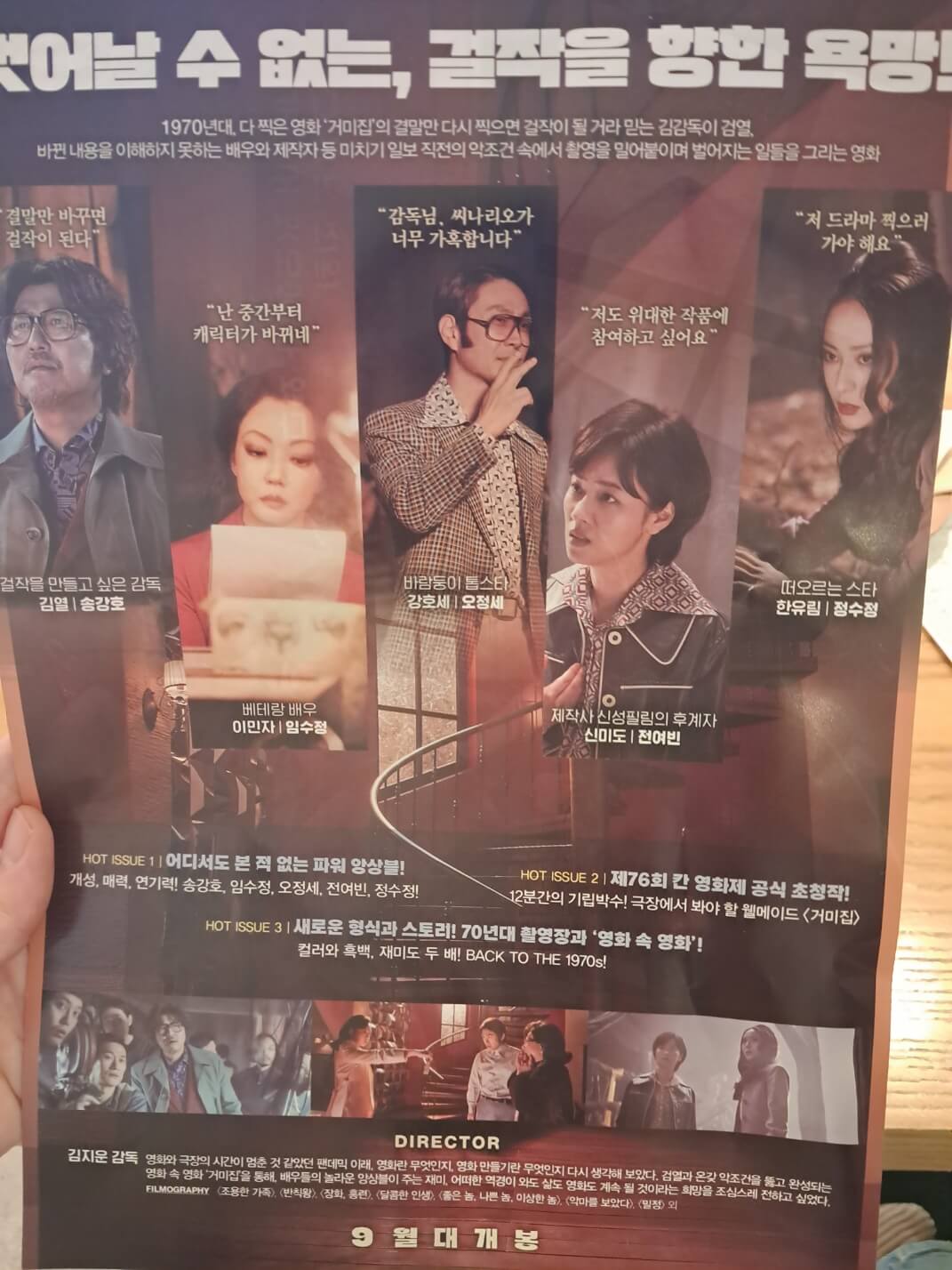 김열감독(송강호)에 의해 한자리에 다시 모인 배우들이 처음에는 이런 저런 이유들로 불만들을 토로하지만 결국에는 영화의 완성을 위해 자신의 배역에 몰입되어 가는 과정을 보며 역시 '배우는 배우구나' 라는 생각이 들더라구요. 그 시대의 분장 스타일도 찰떡이지만 70년대 성우 더빙판 같은 발성들 또한 어쩜 그리 소화들을 잘 하는지... 배테랑 배우들이야 그렇다쳐도 영화배우로 데뷔한 정수정(크리스탈)의 비중이 꽤 큰 편인데 이질감없이 조화로워서 솔직히 놀랐답니다. 아이돌 시절이 생각나지 않을 만큼 배역을 잘 소화해 낸 것 같고 좋은 배우로 성장해 나갈 에너지가 충분하다고 느껴졌어요.