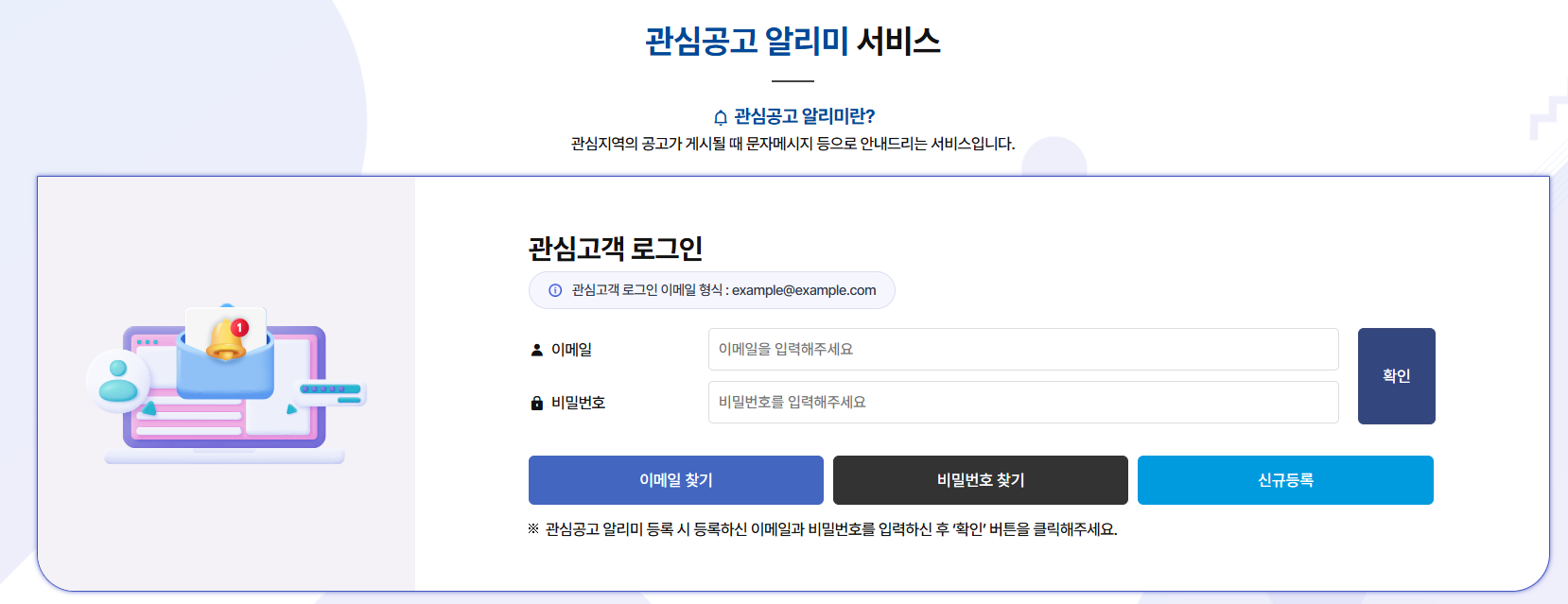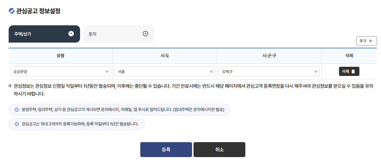 공동인증서(구 공인인증서)로 본인 인증 필요 관심지역 및 주택유형 설정 앱 내 [청약알리미] 또는 [관심단지 등록] 메뉴 선택 원하는 지역, 주택 유형(민영/공공), 면적 등을 설정 푸시 알림 허용 앱 알림 권한을 켜두면, 해당 조건에 맞는 청약 공고가 뜰 때 알림 수신 가능