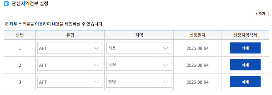 *괸심지역정보 설정 (추가 버튼을 통해 지역을 추가 할 수 있어요)