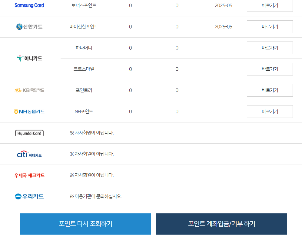이렇게 내가 쌓은 포인트를 카드사별로 한 눈에 볼 수 있어서 정말 편리합니다.